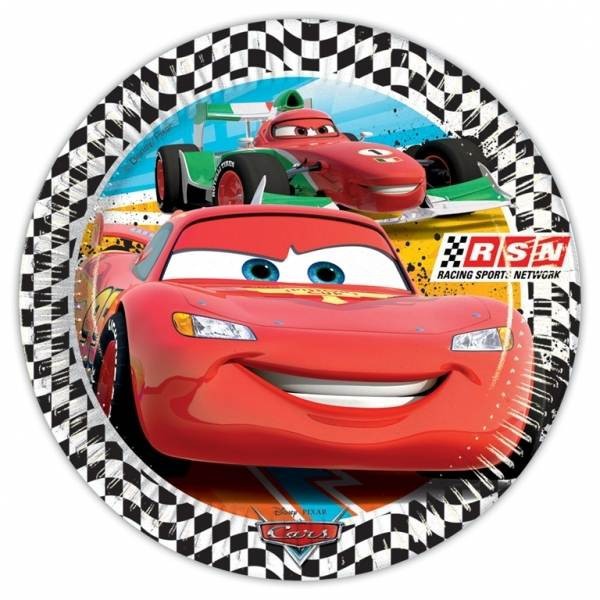 Assiette jetable Cars en carton rond de 23cm de diamètre.